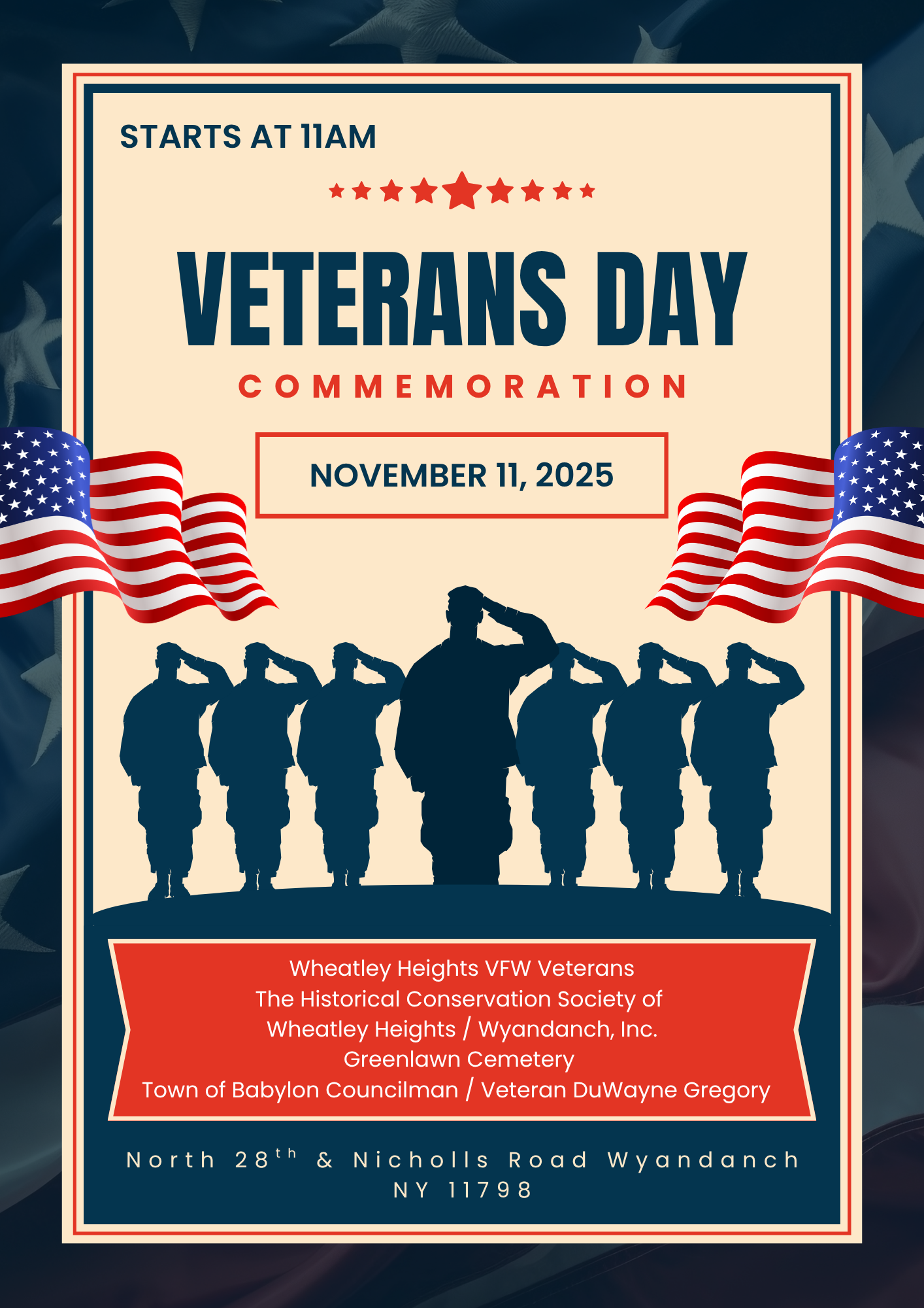 Join us On November 11th at 11:00 AM as we commemorate the Civil War veterans interred at Greenlawn Cemetery. We will enter the premises at North 28th Street and Nicholls Road, Wyandanch New York 11798.